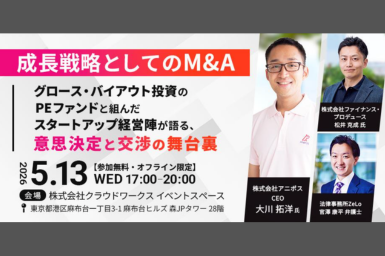 【イベント】26年5月13日開催|スタファイ#12 「成長戦略としてのM&Aグロース・バイアウト投資のPEファンドと組んだスタートアップ経営陣が語る、意思決定と交渉の舞台裏」 2026/04/24 続きを読む >